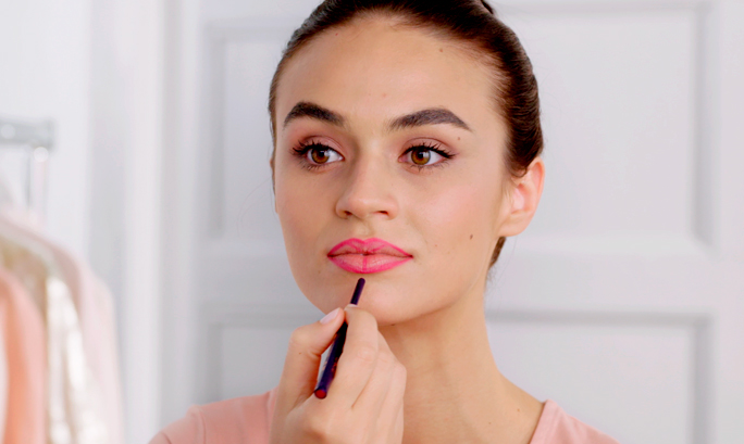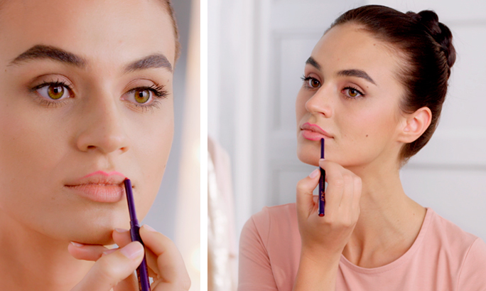 Kezdjük azzal, hogy szájkontúrceruzával kihúzzuk az ajkak külső vonalát. Győződjünk meg róla, hogy olyan színt választunk, ami illik a rúzshoz, amit később használni fogunk.