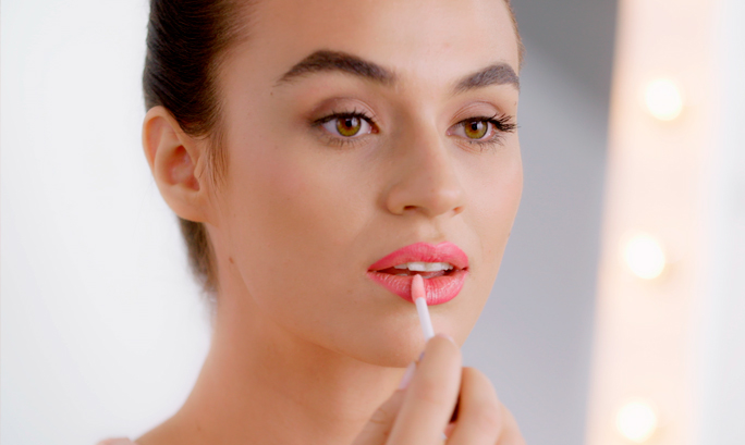 Végül használjunk ugyanolyan színű ajakfényt, hogy egységesítsük a megjelenést. Ezt szintén ütögető mozdulatokkal vigyük fel, majd oszlassuk el egyenletesen a színt.